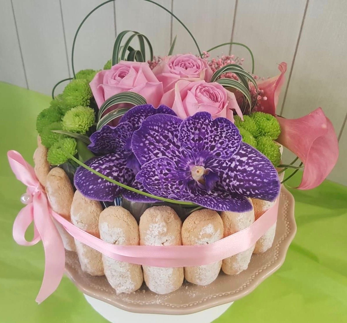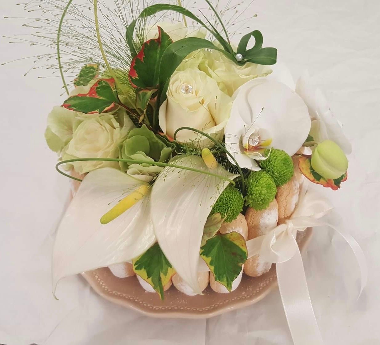 Composition Ronde en Fleurs Coupées avec des Gâteaux autour.